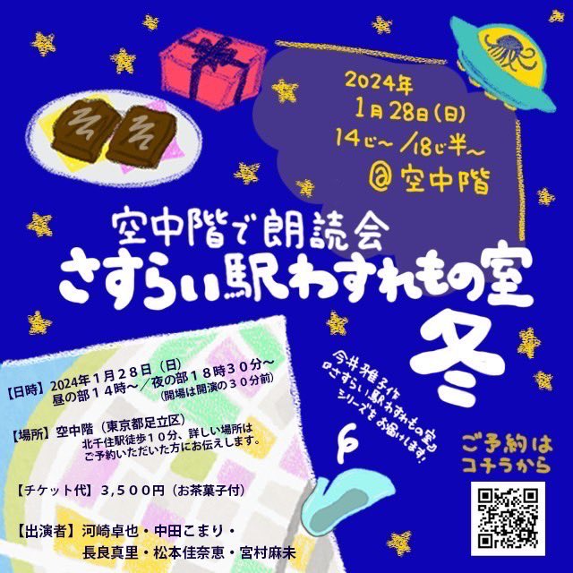Clubhouseで出会った作家と朗読仲間。「春」につづき、心温まる物語をふたたびお届けします。■日時2024年1月28(日) 14:00/18:30(開場は30分前)■会場空中階<アクセス>JR常磐線・東京メトロ千代田線/日比谷線・東武伊勢崎線「北千住」駅 より徒歩10分■料金3,500円(お菓子付き)■演目今井雅子作『さすらい駅わすれもの室』シリーズから5編■出演河崎卓也中田こまり長良真里松本佳奈恵宮村麻未(五十音順)